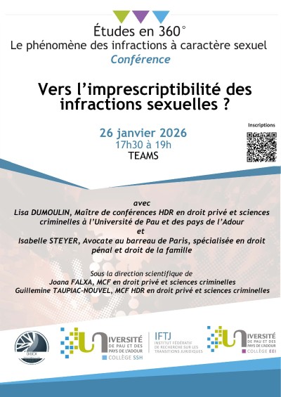 Vers l’imprescriptibilité des infractions sexuelles ?La conférence initialement prévue le lundi 26 janvier, de 17h30 à 19h est reportée à une date ultérieure...