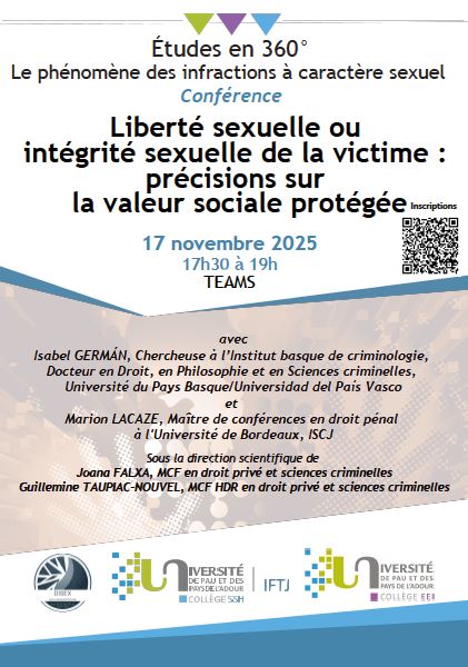 Les conférences « Études en 360° » s’inscrivent dans un cycle annuel qui a pour objet d’étudier de manière approfondie le phénomène infractionnel sexuel dans ses diverses dimensions, juridique, sociale, psychologique, criminologique, philosophique. Organisées par deux enseignantes-chercheuses de l’UPPA appartenant au Centre de recherche sur la justice pénale et pénitentiaire de l’IFTJ (CRJ2P), ces conférences en ligne, mensuelles, d’une durée de 1h30, aborderont les problématiques actuelles et sensibles autour du phénomène infractionnel sexuel.