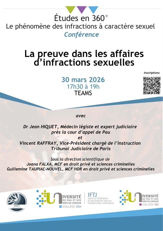 Dans le cadre du cycle de conférences "Etudes en 360° : le phénomène des infractions à caractère sexuel " sous la direction scientifique de Joana Falxa et Guillemine Taupiac-Nouvel